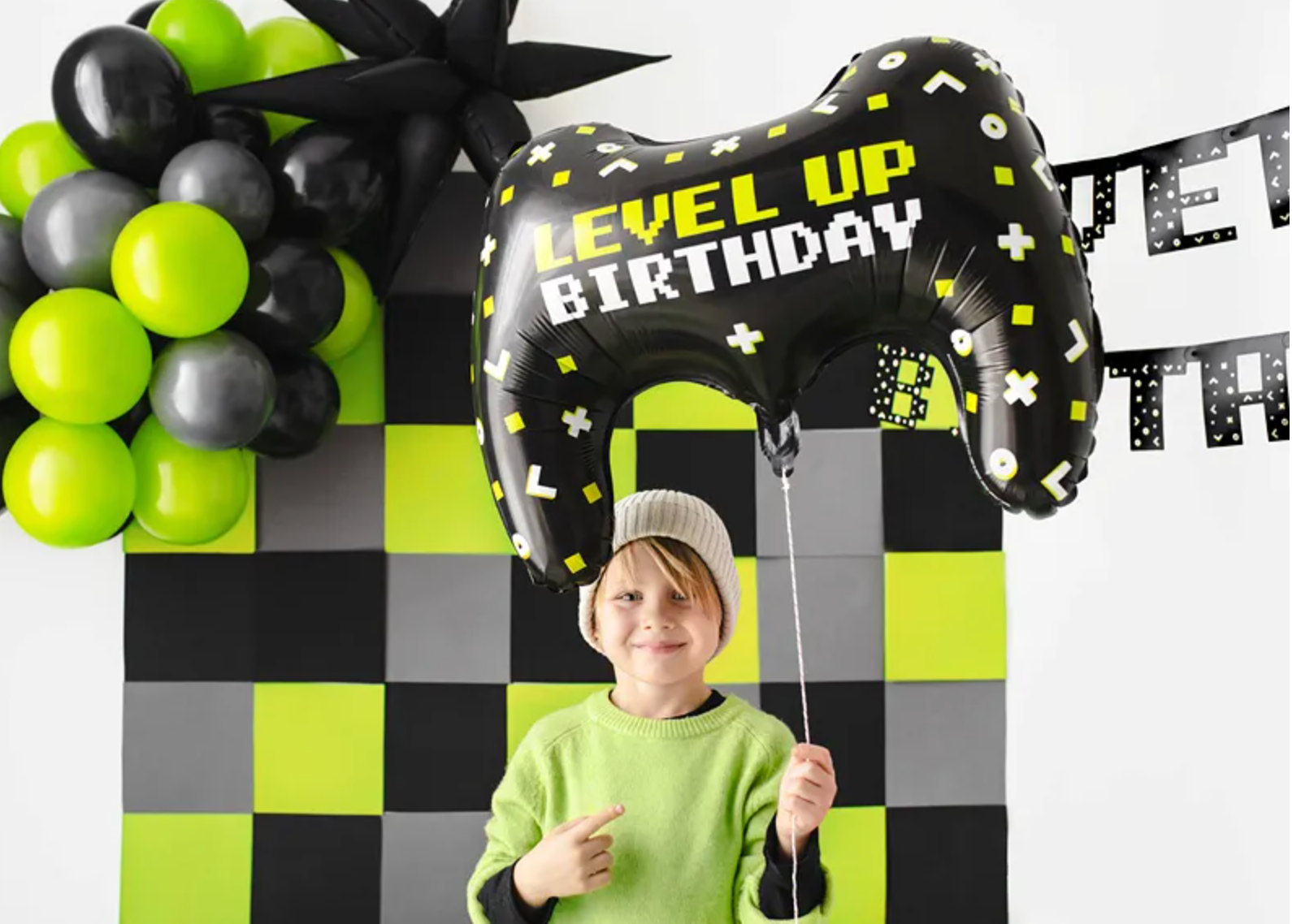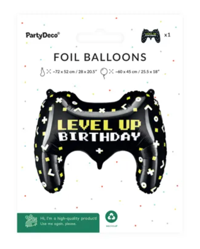 Balon foliowy Gamepad w kolorze czarnym z kolorowym nadrukiem i napisem ''Level up Birthday'', wymiary przed napompowaniem ok. 72 x 52 cm (28 x 20.5''), wymiary po napompowaniu ok. 60 x 45 cm (25.5 x 18''). Do napompowania powietrzem i helem. Zestaw zawiera słomkę.