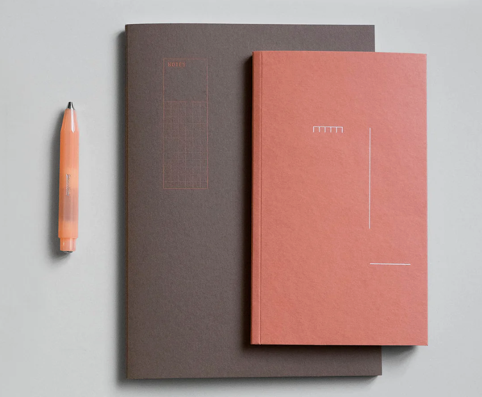 Notesy są w bardzo poręcznym formacie 12x20 cm. Wzór na okładce naniesiony jest metodą hotstampingu w kolorze srebrnym. Środek szyty nićmi i oprawiony w sposób, który pozwala mu otwierać się i leżeć całkowicie płasko. Dodatkową wygodą są szerokie skrzydełka. Do wyboru są cztery kolory okładek: rudy, różowy, beżowy, brązowy. Każdy z wariantów kolorystycznych ma inny motyw lica. W środku notesu są czyste strony z gładkiego, ale niepowlekanego papieru, dzięki czemu świetnie nadaje się do pisania piórem (atrament nie strzępi i stosunkowo szybko schnie). Poznaj lepiej właściwości naszego papieru i sprawdź, za co go uwielbiamy!
