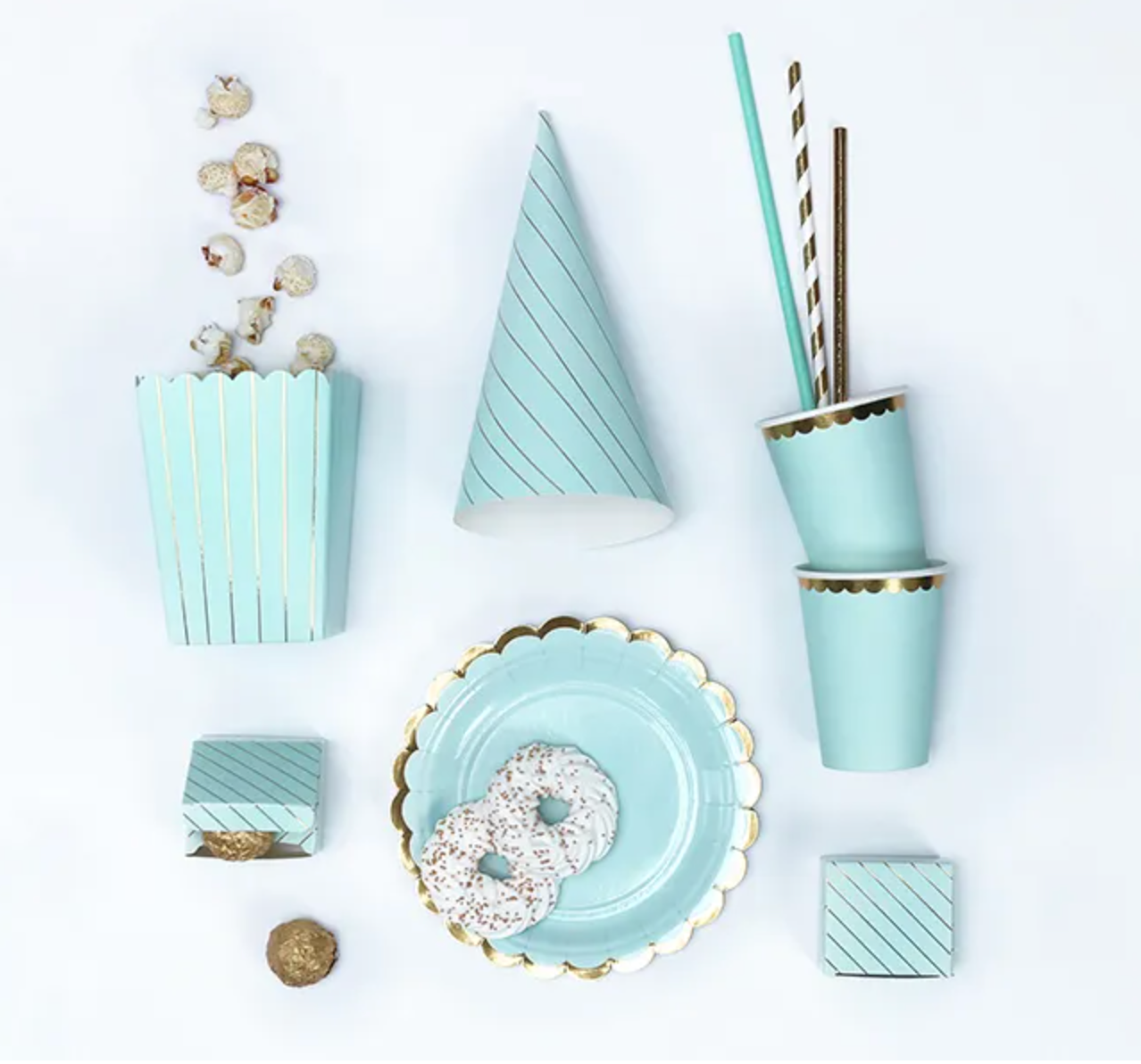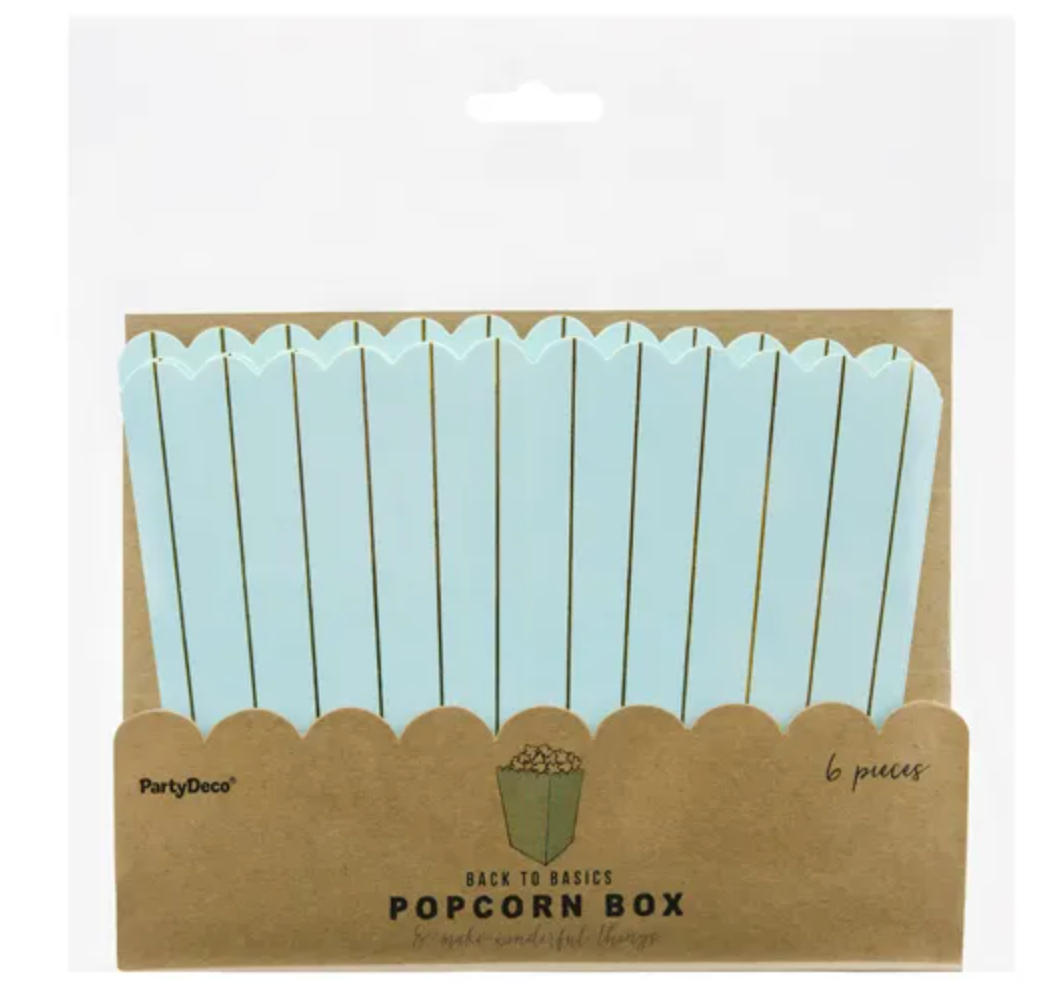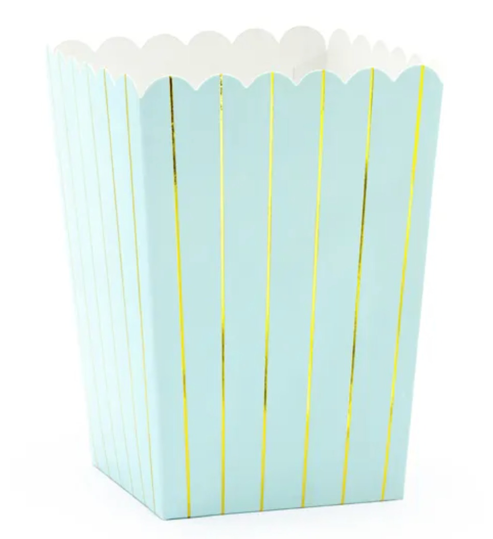 Pudełka na popcorn w kolorze jasnoniebieskim w złote paski, wymiary po złożeniu ok. 7 x 7 x 12,5 cm.(1 op.... Czytaj więcej