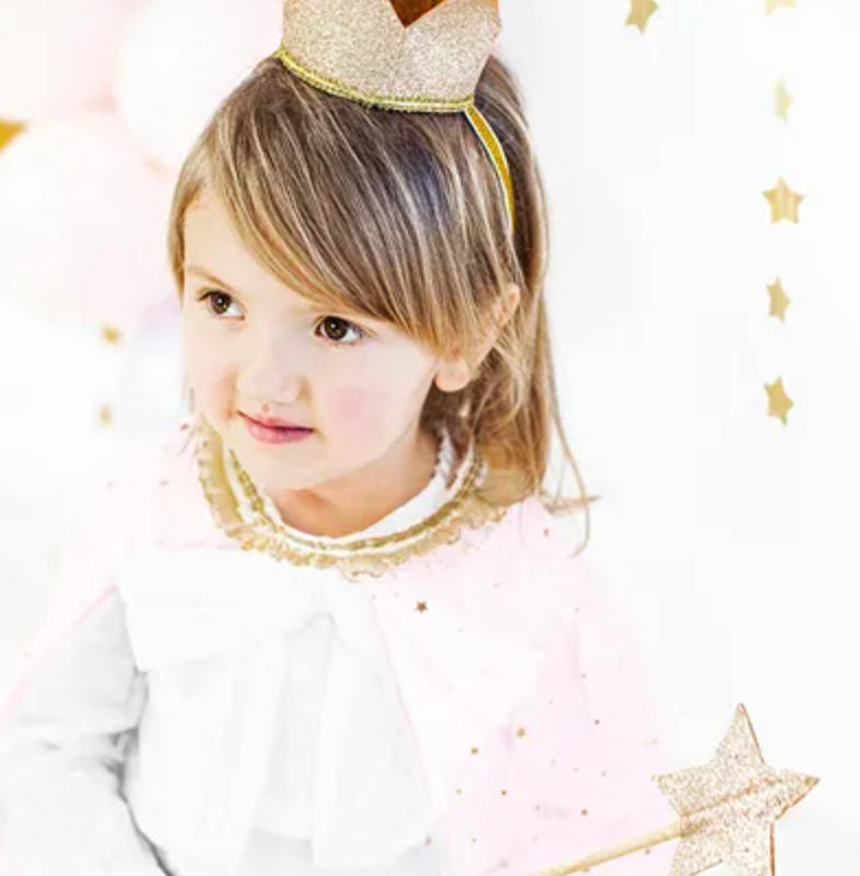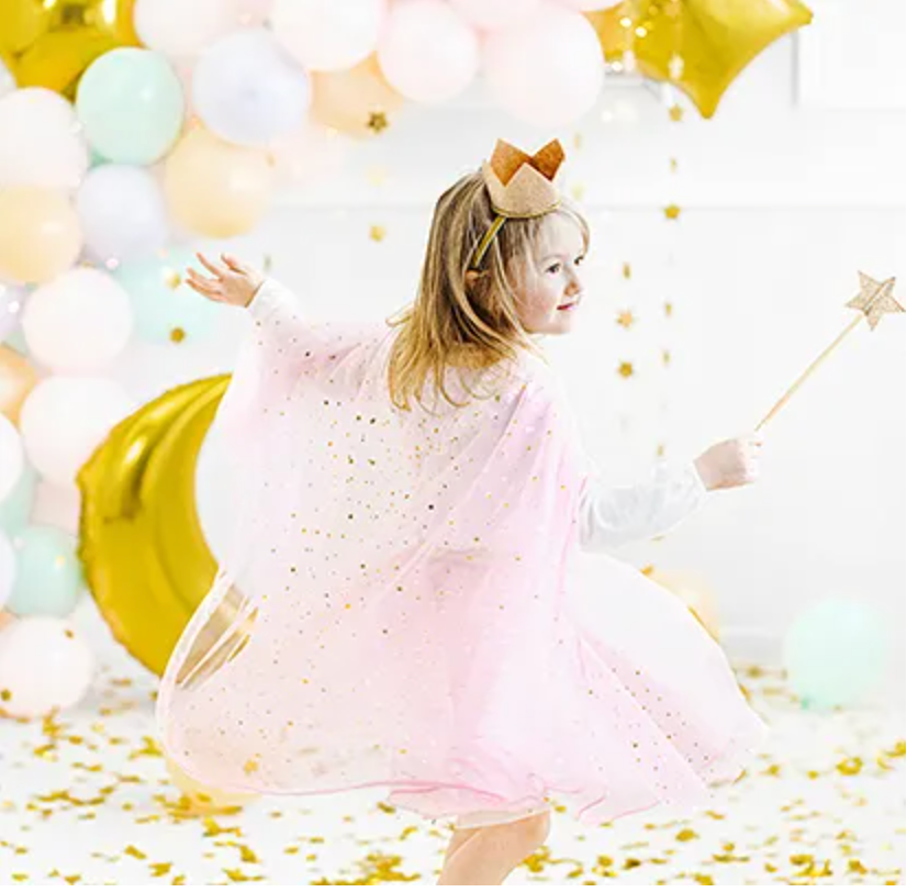 Strój Księżniczki - Peleryna w kolorze różowym ze złotym wzorem, przeznaczony dla dzieci w wieku 3-7 lat. Czytaj więcej