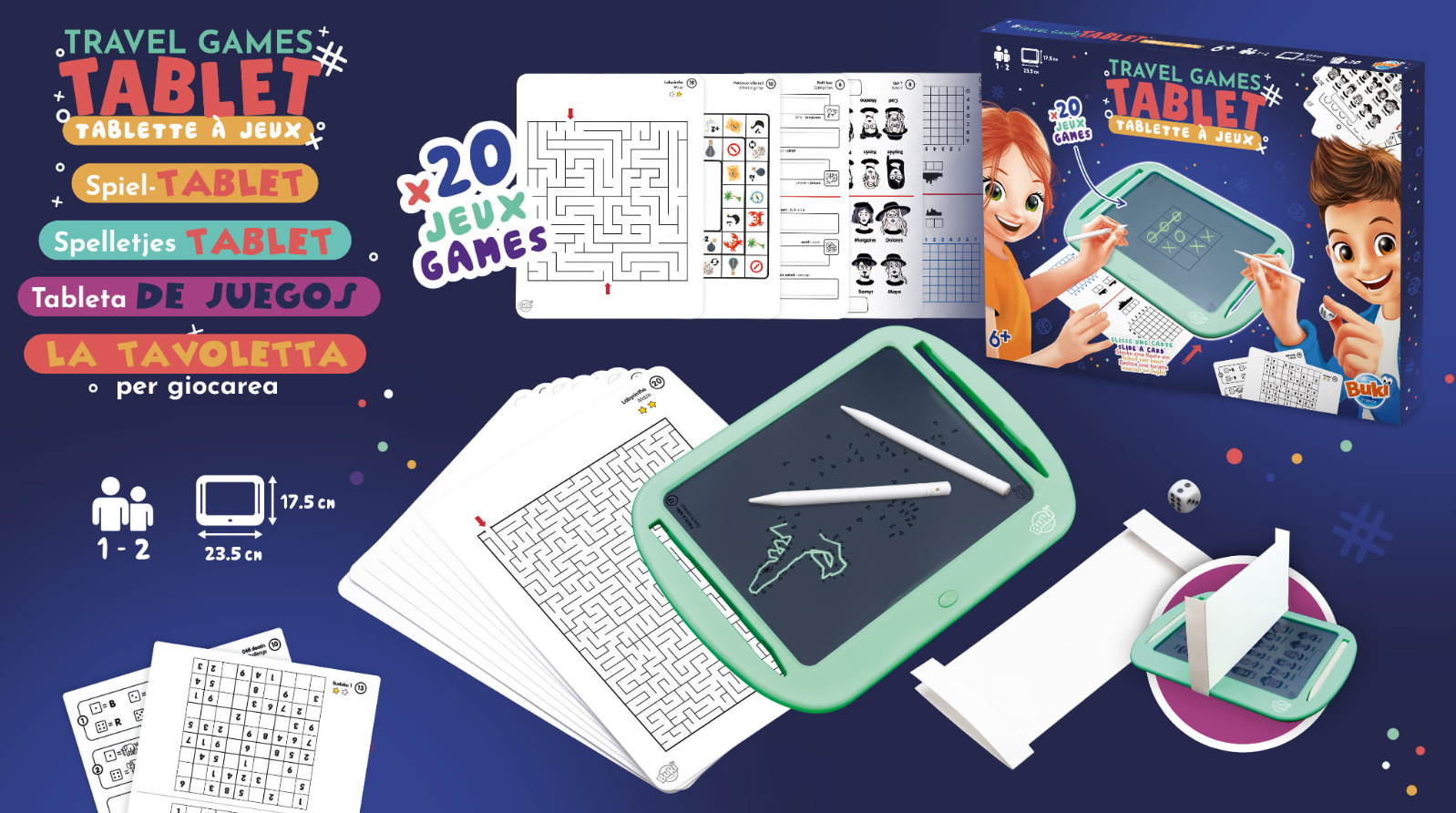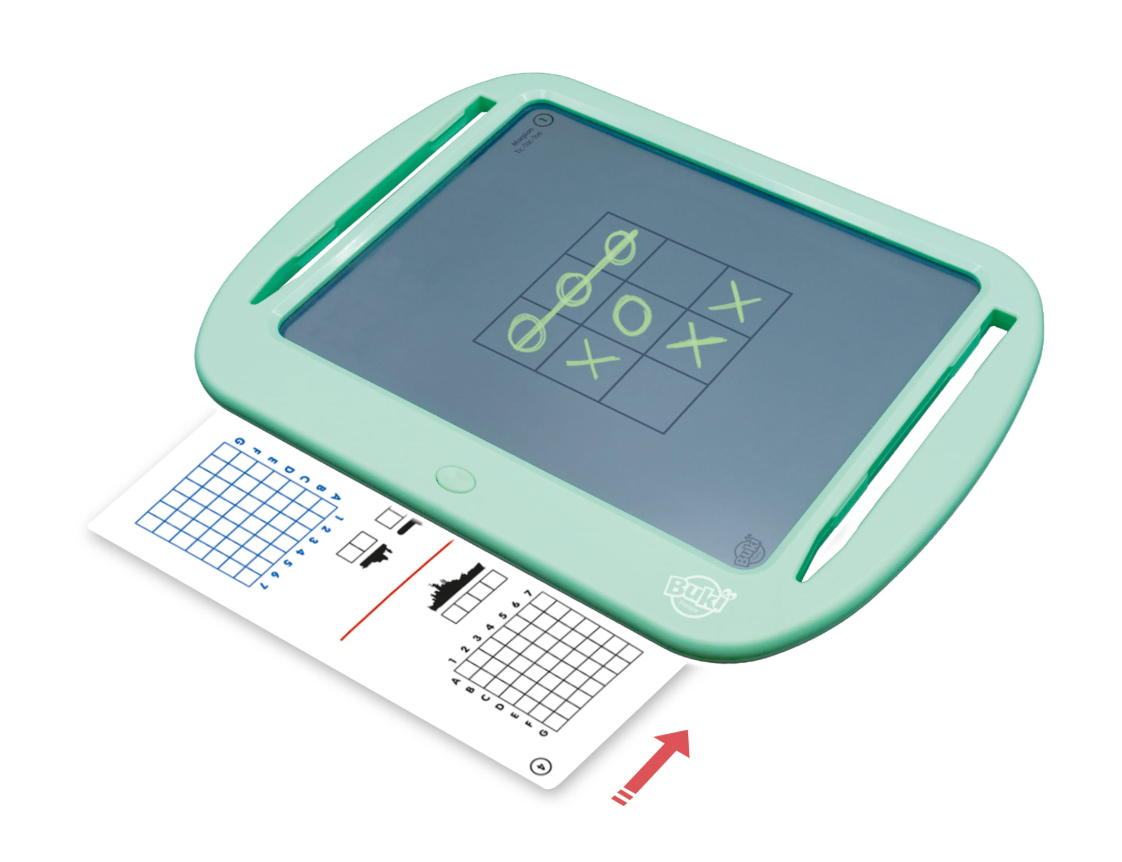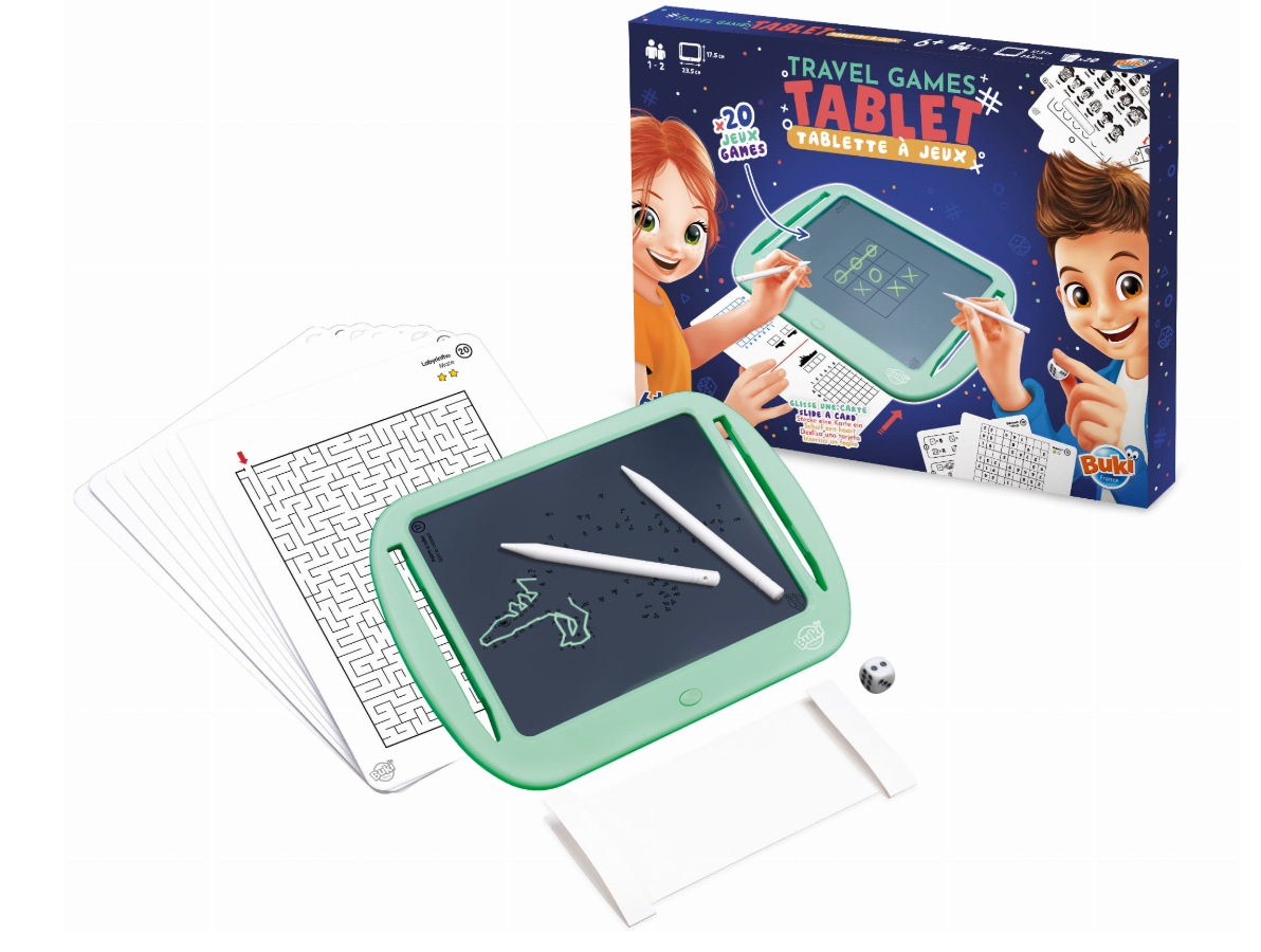 Tablet z ekranem LCD do grania w gry podróżne: samemu lub w parach. Włóż kartę z wybraną grą pod wyświetlacz, aby zagrać w takie gry jak kółko i krzyżyk, wisielec, statki, sudoku i inne. Do wyboru aż 20 różnych gier! Rozwiązania zaznacza się pisząc po ekranie specjalnymi rysikami dołączonymi do zestawu. Po zakończeniu wystarczy kliknąć przycisk, aby wymazać zapiski. Mały guzik z tyłu tabletu blokuje ekran, gdy chcemy zachować notatki na dłużej lub zrobić przerwę.