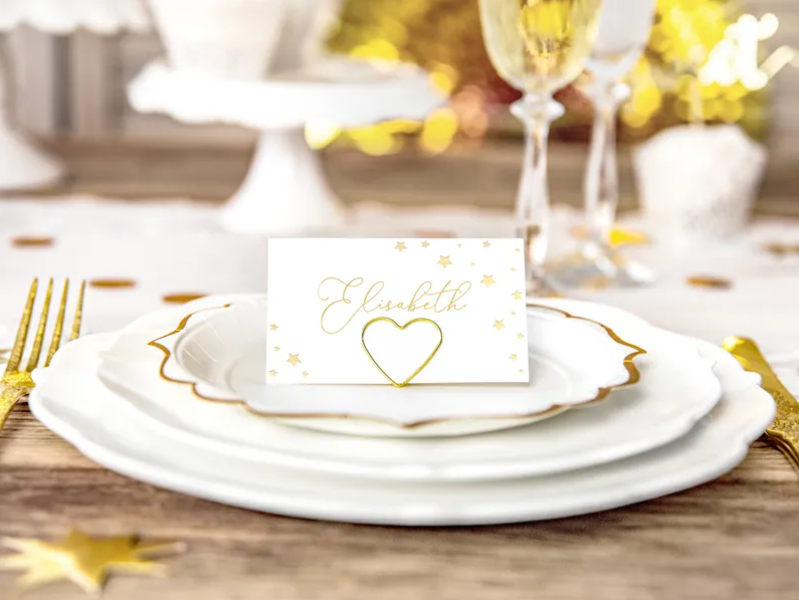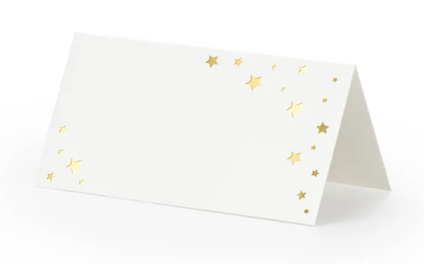 Winietki na stół Let's Celebrate wykonane z papieru w kolorze białym ze złotymi gwiazdkami, wymiary ok. 9,5 x 5,5 cm.