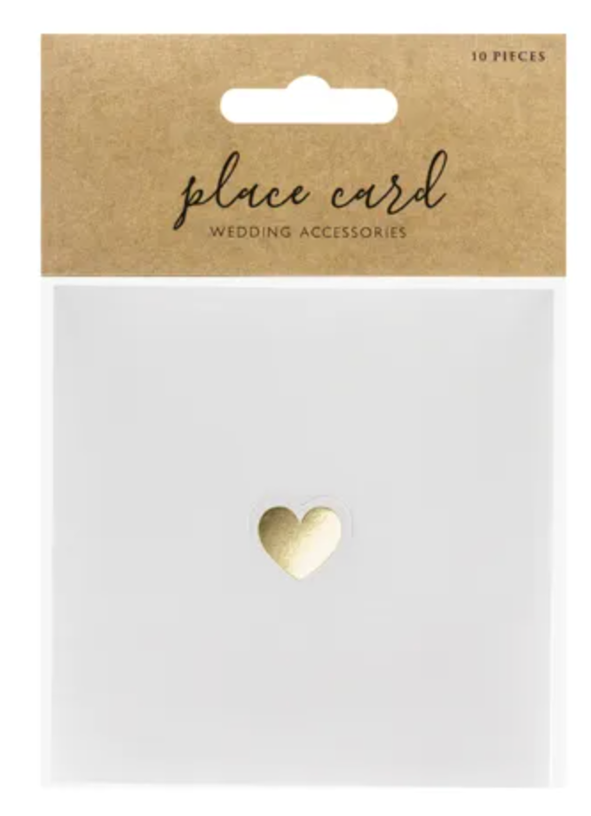 Winietki na stół wykonane z papieru w kolorze białym, ze złotym metalizowanym sercem, wymiary po złożeniu ok. 10 x 5 cm.