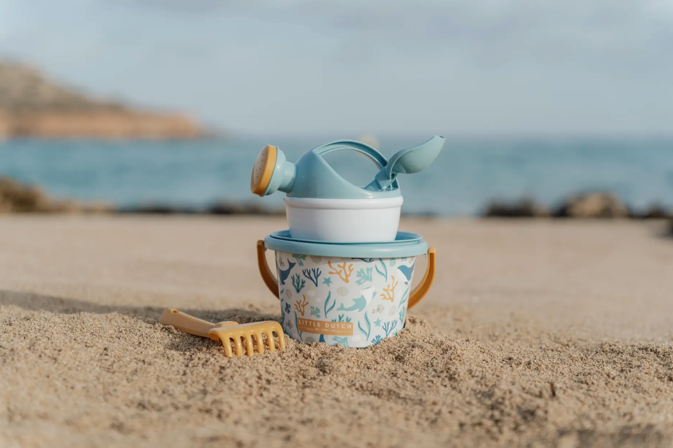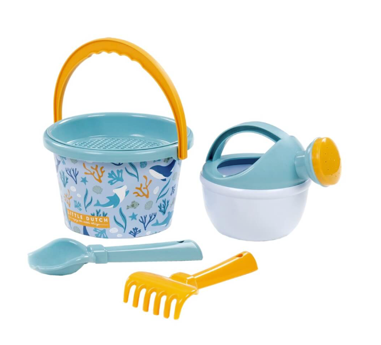 en 5-cio częściowy zestaw zawiera wszystkie gadżety, których Twoje dziecko będzie potrzebowało na plaży lub w piaskownicy: wiaderko, konewka, łopatka, grabki i sitko. Wykonany w niebieskiej kolorystyce z żółtymi akcentami motywu Ocean Dreams. Doskonała zabawa w wodzie i na plaży!